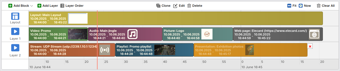 To add a block to the schedule, simply drag it onto the required timeline layer.