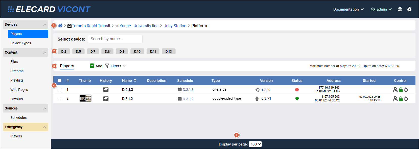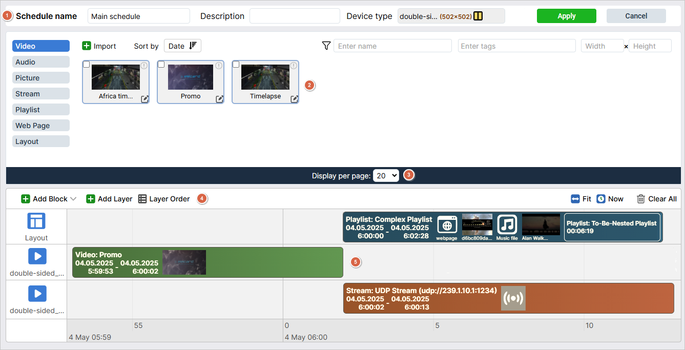 Playlists are sets of elements uploaded to the system. They can be of two types: ordinary and emergency. An ordinary playlist consists of video, audio, and images and can be added to a schedule for planned playback. An emergency playlist is used for organizing emergency broadcasting and cannot be added to a schedule. You can find more information about emergency playlists in the Emergency section.