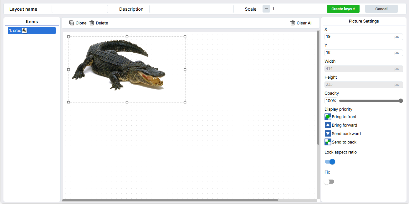 In the center of the editor, there is a work area. It is in this area that you create a layout by adding and combining items. Above the area, there is a panel where you need to write the layout name. Here, you can also provide the layout description, change the scale of the work area, or view the current layout size.