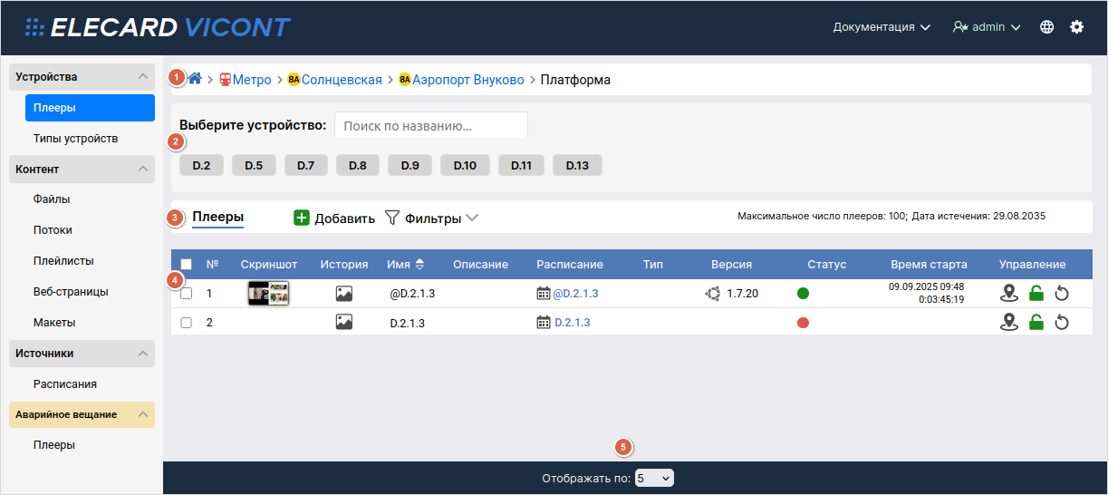 Предположим, необходимо демонстрировать навигацию на станциях Московского метрополитена. Тогда можно создать следующую структуру: Метро → линии метро → станции на линии → зоны на станции, например платформа, переход, вестибюль и т.д. Далее в каждой зоне можно создать список устройств, на которые будет выводиться контент, чтобы затем привязать плеер к определенному устройству при добавлении.