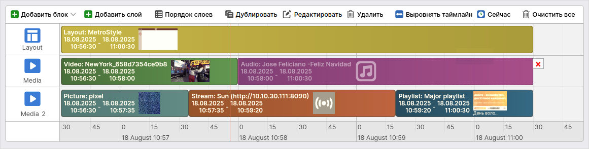 Чтобы скорректировать отображение блоков, нажмите на кнопку Выровнять таймлайн. Масштаб графика изменится так, что все блоки будут отображены на одном экране. Кнопка Сейчас позволяет перейти к текущему моменту на таймлайне. С помощью кнопки Очистить все можно удалить все блоки и очистить расписание.