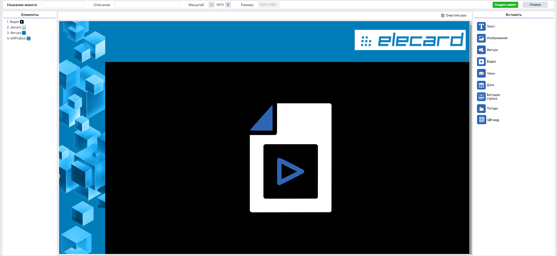 Чтобы загрузить готовый макет, на странице Макеты нажмите на кнопку Импортировать и выберите архив с макетом. Далее укажите Имя макета и при необходимости его описание. Чтобы завершить добавление макета, нажмите на кнопку Загрузить. Чтобы удалить неиспользуемый макет из списка, отметьте нужный макет галочкой в таблице и нажмите на кнопку Удалить. Для применения макета добавьте его в расписание.