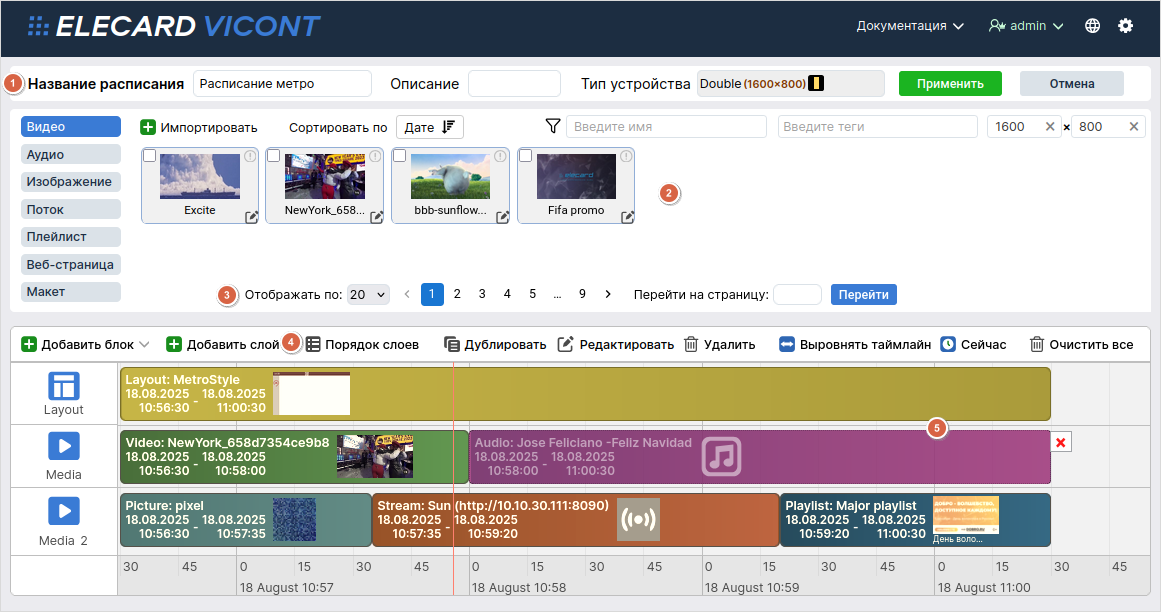 Создание/редактирование расписания происходит на отдельной странице, которая предлагает набор инструментов для формирования порядка воспроизведения медиафайлов и макетов. Страница состоит из пяти элементов: